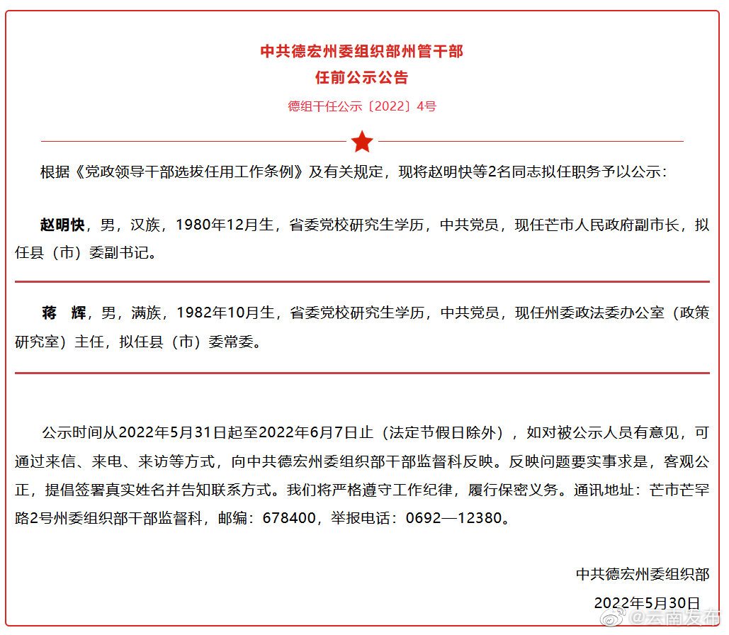 德宏州組織部最新公示發(fā)布,展示了組織的日常工作和成果。公示背后蘊(yùn)含著許多故事,體現(xiàn)了組織的溫馨與努力。通過公示,人們可以更加了解德宏州組織部的工作內(nèi)容和方向,感受到組織部門的用心和付出。德宏州組織部一直致力于為人民群眾提供更好的服務(wù),公示是組織部門與公眾之間溝通的橋梁,有助于增強(qiáng)公眾對組織的信任和支持。